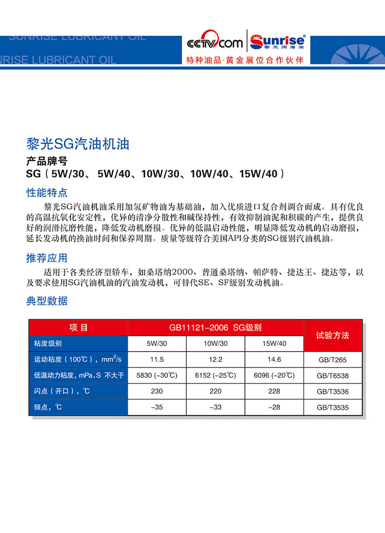 粘度级别 | 单级粘度30、40、50 | 5W-30、5W-40 | 10W-30、10W-40 | 15W-30、15W-40 | 20W-50 |