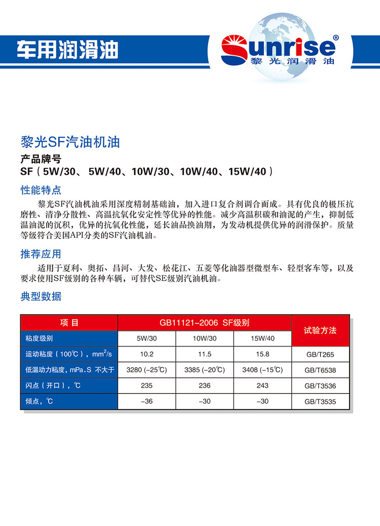 粘度级别 | 单级粘度30、40、50 | 5W-30、5W-40 | 10W-30、10W-40 | 15W-30、15W-40 | 20W-50 |