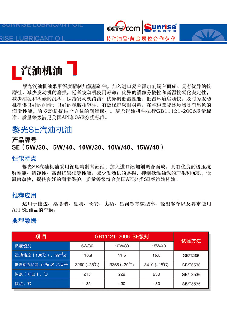 粘度级别 | 单级粘度30、40、50 | 5W-30、5W-40 | 10W-30、10W-40 | 15W-30、15W-40 | 20W-50 |